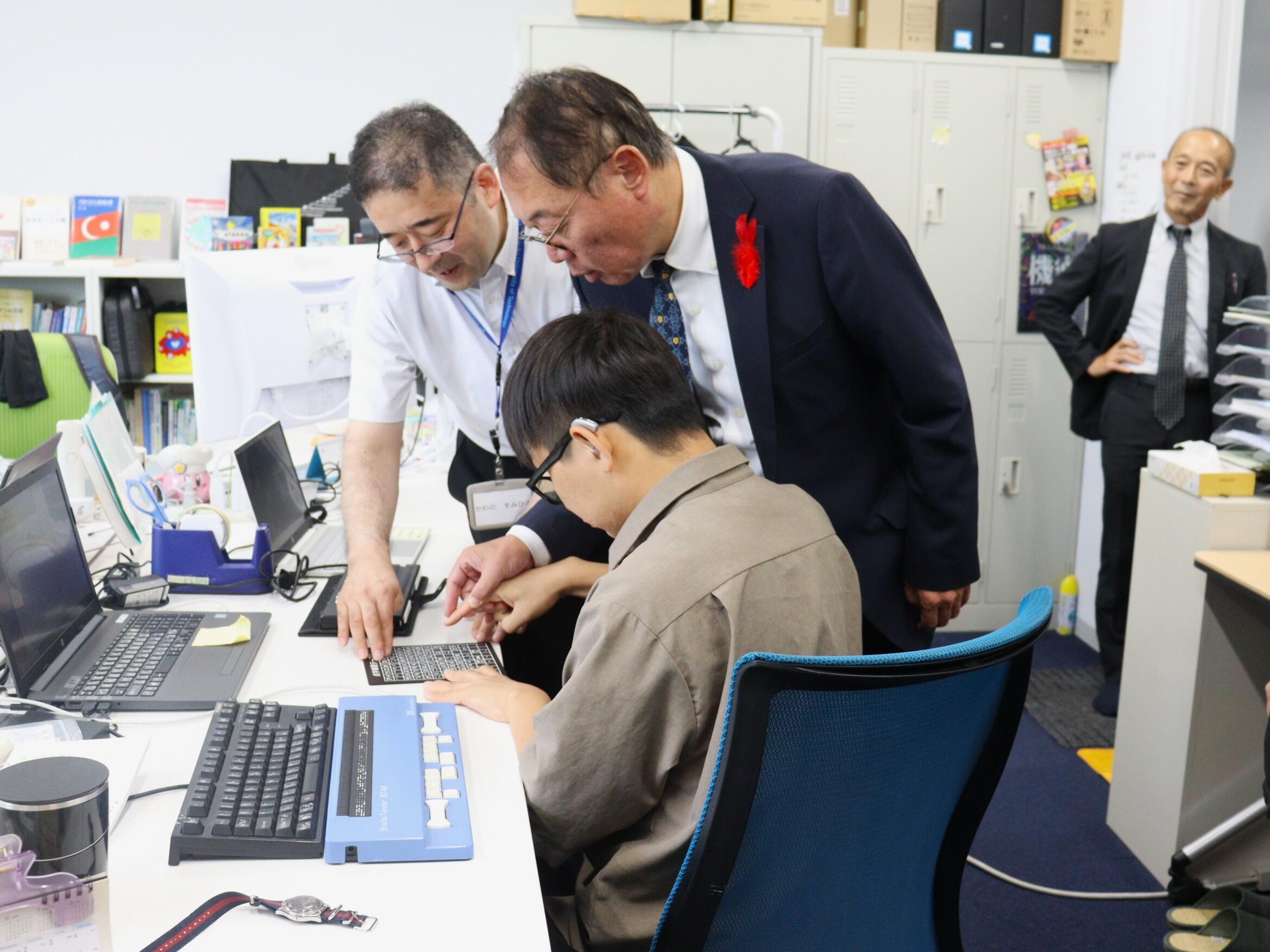 盲ろう職員の勤務状況の見学の様子。職員の使用する点字シートや点字ディスプレイを増子事務次官が触っている。PEPNet-Japanの取り組み紹介の様子産業技術学部教授の研究紹介の様子